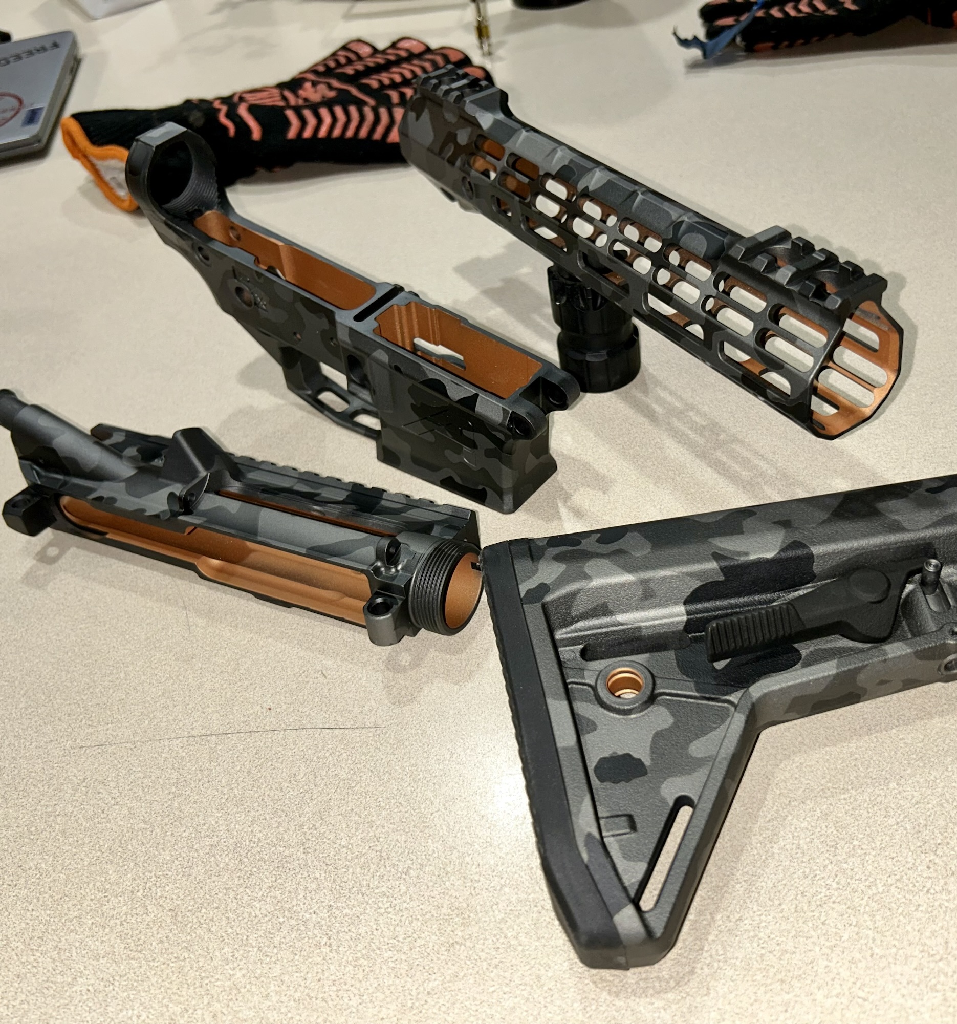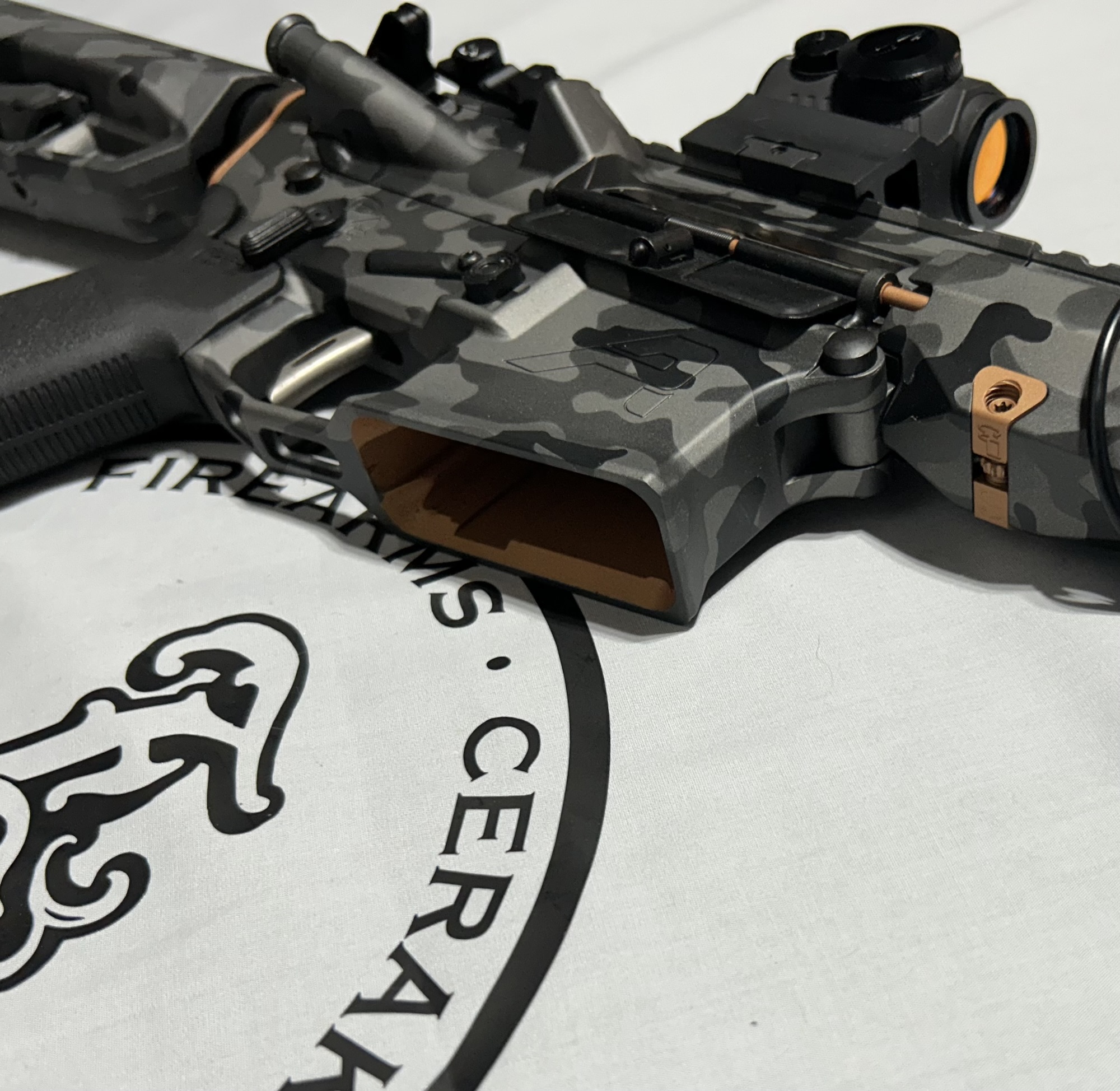 A Freedom Seeders exclusive finish applied in-house, this builders set features a custom mixed urban camo exterior. What truly sets this set apart from the rest is its bold copper interior interior of the receivers and handguard w/ copper Aero Taper Lock. Set includes Aero Precision M4E1 threaded receiver set and Atlas S-One Handguard in your choice of 7.3″, 9.3″, 10.3″, 12.7″, or 15″ length. (10.3″ handguard shown)
