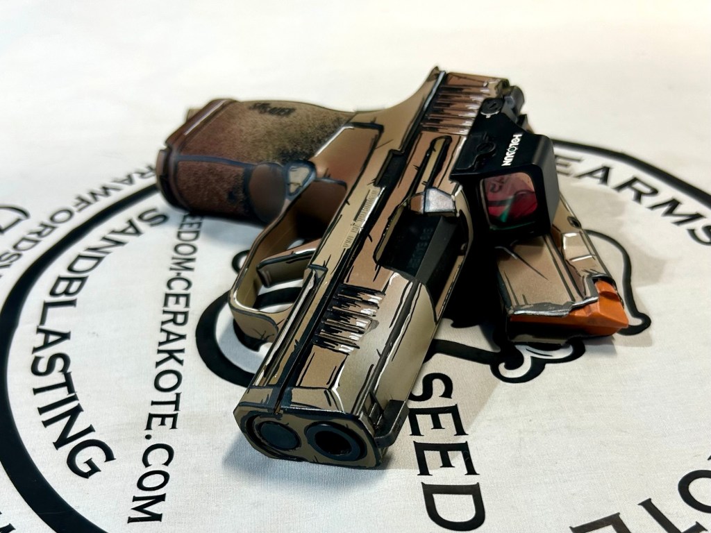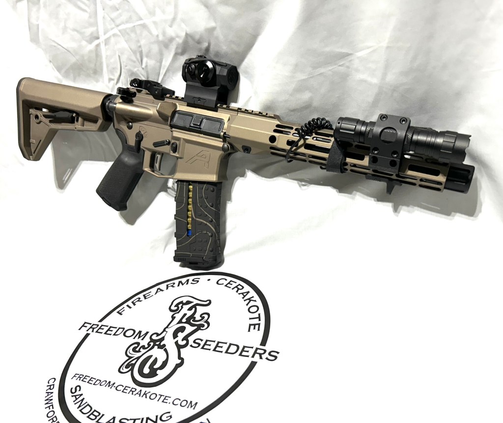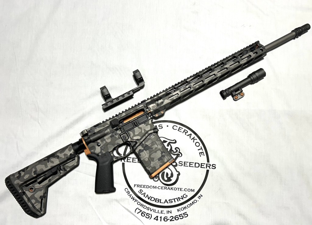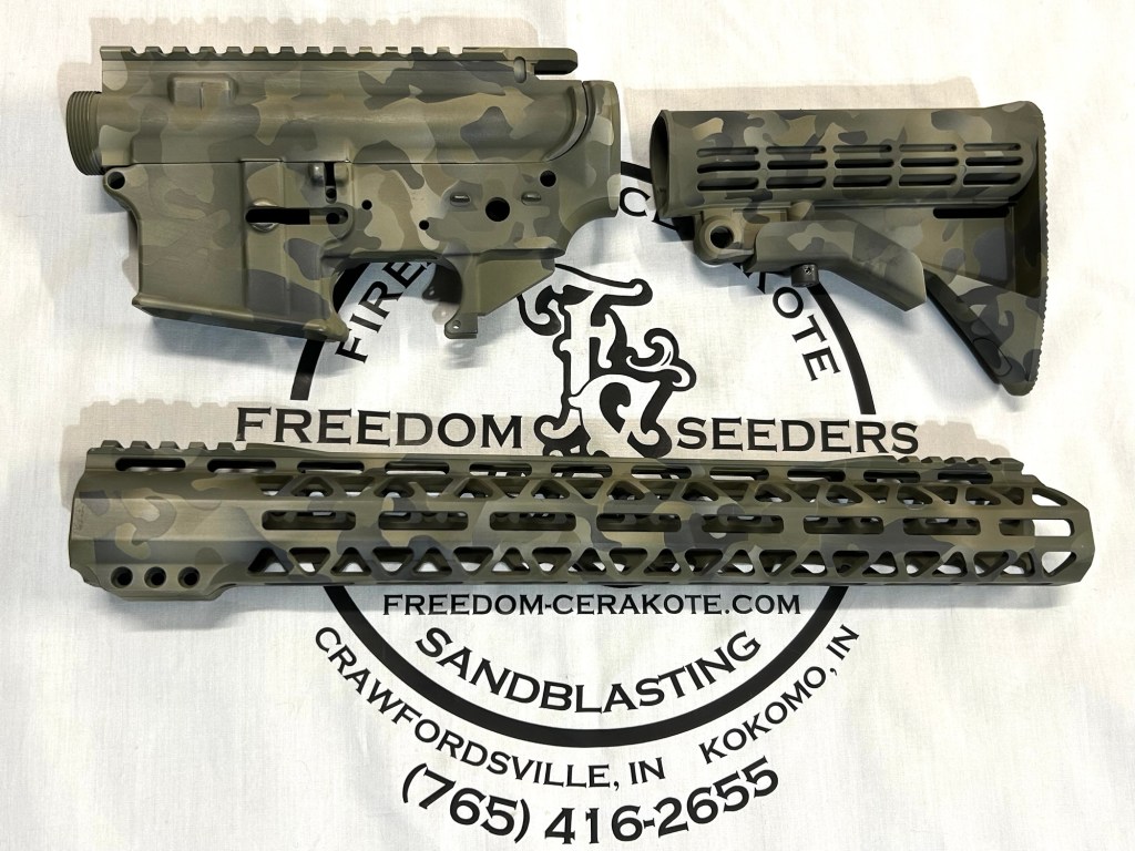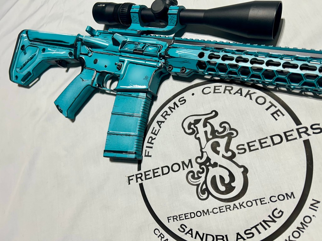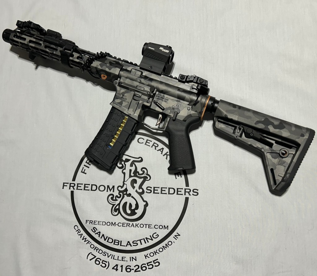 Custom-Mixed Grey/Gold P365XLCel Shade/Comic Book AR Receiver Set + HandguardCel Shade SigFlaked/Glitter coated GlockHighland Ghost Camo AR SetHellcat Cel ShadeChocolate Chip Camo Glock SlideSpringfield Saint Victor Cel ShadeGreen Ghost Camo AR Build SetDirt Bike Components in Titanium + Graphite BlackAR9 backpack build in our winter take on Kuiu Vias camoCel Shade / Borderlands SigsRusty Rossi plinker cleanupUrban Camo 2-tone Ruger SFAR .308PT145 Cel ShadeGlock Slide Assembly. Colors: GunCandy MongooseCivil War Kentucky Rifle full restorationCel Shaded AR-10 LowerMossberg 715TBrowning CitoriP365 XL Macro“Tiger Shark” EPC 9mm buildMossberg 715TP-51 Mustang inspired Springfield XD9Black & white distressed American flag on Taurus G3CCel shaded/manga themed ARUrban camo receiver set, hadndguard, & stock on a Freedom Seeders custom buildTaurus G2S in brushed copper finishCustom AR buildFull P365XL full jobHandguard & receiver set in dark distressed copperGalaxy can-cannonCustom Glock 19 – built by Freedom Seeders Firearms – Colors: GunCandy Mongoose + Smoked BronzeAR9 with receiver and handguard done in 2-tone finishSig P365x-Macro Colors: Robins Egg Blue topped with GunCandy Pegasus on the slide + mags. Frame: Desert Sand base + topped with GunCandy AlpineFreedom Seeders custom buildEPC9 build put together through our FFL location.Sig P365XLA start to finish from raw aluminum, sandblasting, to coating.Glock Slide with Armor Black base topped with GunCandy ViperCustom PMags are the easiest way to make your firearm stand out or quickly distinguish different calibers. Provide your own, or let us provide them new for you!Cerakote Suppressor work? We’ve got some awesome ideas!Options capable of withstanding 1800° are perfect for your go-fast partsAnother hardware restoration project for a historic home. 1904 hardware door hardware brought back to life while preserving the vintage finish of the rest of the home.Hardware restoration? We can help! Laying down some color samples after sandblasting a few pieces for a customer (first 2 pictures). Finally ended on an ‘oil rubbed bronze’ look, using Copper and Graphite BlackAntique restoration and refinishingBefore & After – 20” Wheels in Glacier Gold C-SeriesNever loose your tools again and be seen in low light with Cerakote’s Hi-Vis Orange.Ghost topography stencil work. Colors: Custom mixed grey base, Crushed Aluminum mid-coat, topped with GunCandy Kraken top-coat.Aero Precision receiver and SLR handguard AR9 – Built by Freedom Seeders FirearmsQuite a bit more than Cerakote went into this on. Fire controls stripped repaired and Cerakote in Graphite Black. The original brass was cleaned and polished. Wood Stock repaired and refinished. New ramrod made and stained to match. Barrel stripped, new ramrod thimbles installed. Cerakote in Black Velvet + Graphite BlackFreedom Seeders tumblers available now! Pick one up today, or let us custom make one with your design or logo.A few custom tumbler projects. Dark hand-distressed flag Tumbler, bulk run. Available nowAntique tackle box turned vintage distressed shop tool box
