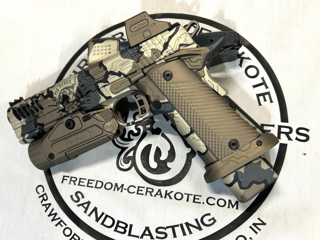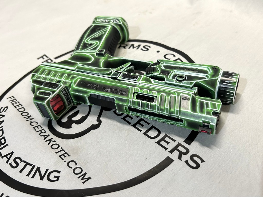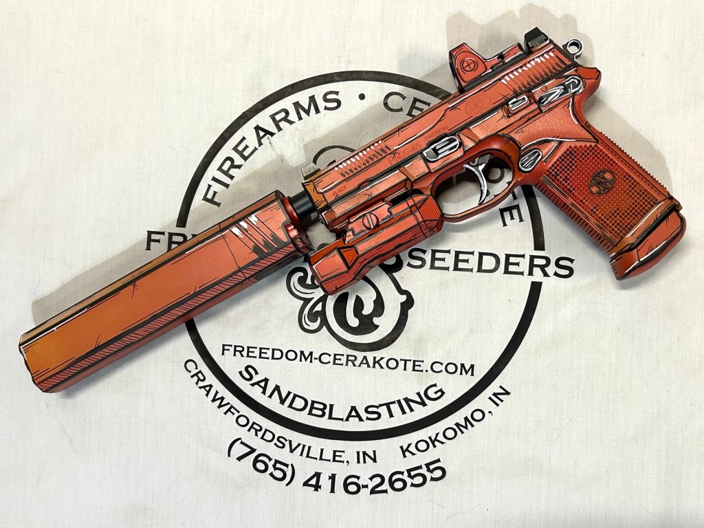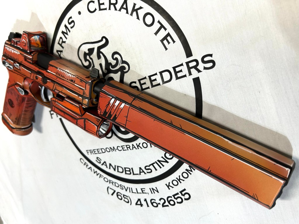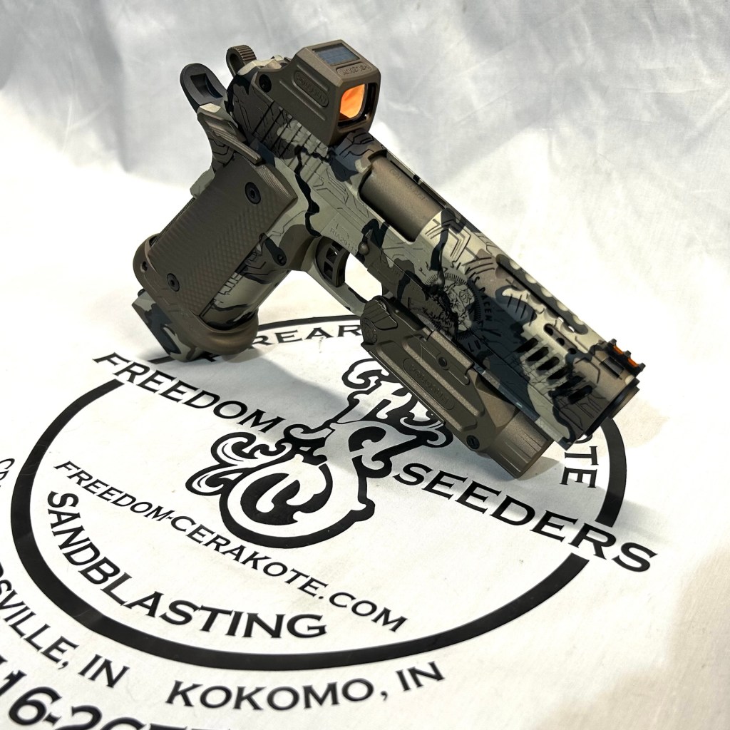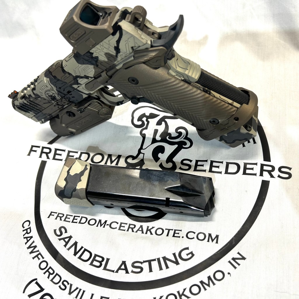 Glittered Custom Glock SlideMetallic Kuiu Vias Camo 1911Hibiscus Print Glock Slide + AccessoriesWhite Cel Shade on a Freedom Seeders AR9 Custom BuildDistressed Gold Desert Eagle Restoration HK CC9 Barrel + Controls in HK Red w/ Black Color Filled LetteringCel Shade Sig P322 + Holosun Red DotNeon Lights/Tron Style Canik SFX Rival + Holosun Optic/LightRefinished Rifle Receiver – yep, we do simple jobs tooBrowning CitoriNeon/Tron style on P365 Macro XCustom-Mixed Grey/Gold P365XLCel Shade/Comic Book AR Receiver Set + HandguardCel Shade SigFlaked/Glitter coated GlockHighland Ghost Camo AR SetHellcat Cel ShadeChocolate Chip Camo Glock SlideSpringfield Saint Victor Cel ShadeDirt Bike Components in Titanium + Graphite BlackAR9 backpack build in our winter take on Kuiu Vias camoCel Shade / Borderlands SigsRusty Rossi plinker cleanupUrban Camo 2-tone Ruger SFAR .308PT145 Cel ShadeGlock Slide Assembly. Colors: GunCandy MongooseCivil War Kentucky Rifle full restorationCel Shaded AR-10 LowerMossberg 715TGreen Ghost Camo AR Build SetP365 XL Macro“Tiger Shark” EPC 9mm buildMossberg 715TP-51 Mustang inspired Springfield XD9Black & white distressed American flag on Taurus G3CCel shaded/manga themed ARUrban camo receiver set, hadndguard, & stock on a Freedom Seeders custom buildTaurus G2S in brushed copper finishCustom AR buildFull P365XL full jobHandguard & receiver set in dark distressed copperGalaxy can-cannonCustom Glock 19 – built by Freedom Seeders Firearms – Colors: GunCandy Mongoose + Smoked BronzeAR9 with receiver and handguard done in 2-tone finishSig P365x-Macro Colors: Robins Egg Blue topped with GunCandy Pegasus on the slide + mags. Frame: Desert Sand base + topped with GunCandy AlpineFreedom Seeders custom buildEPC9 build put together through our FFL location.Sig P365XLA start to finish from raw aluminum, sandblasting, to coating.Glock Slide with Armor Black base topped with GunCandy ViperCustom PMags are the easiest way to make your firearm stand out or quickly distinguish different calibers. Provide your own, or let us provide them new for you!Cerakote Suppressor work? We’ve got some awesome ideas!Options capable of withstanding 1800° are perfect for your go-fast partsAnother hardware restoration project for a historic home. 1904 hardware door hardware brought back to life while preserving the vintage finish of the rest of the home.Hardware restoration? We can help! Laying down some color samples after sandblasting a few pieces for a customer (first 2 pictures). Finally ended on an ‘oil rubbed bronze’ look, using Copper and Graphite BlackAntique restoration and refinishingBefore & After – 20” Wheels in Glacier Gold C-SeriesNever loose your tools again and be seen in low light with Cerakote’s Hi-Vis Orange.Ghost topography stencil work. Colors: Custom mixed grey base, Crushed Aluminum mid-coat, topped with GunCandy Kraken top-coat.Aero Precision receiver and SLR handguard AR9 – Built by Freedom Seeders FirearmsQuite a bit more than Cerakote went into this on. Fire controls stripped repaired and Cerakote in Graphite Black. The original brass was cleaned and polished. Wood Stock repaired and refinished. New ramrod made and stained to match. Barrel stripped, new ramrod thimbles installed. Cerakote in Black Velvet + Graphite BlackFreedom Seeders tumblers available now! Pick one up today, or let us custom make one with your design or logo.A few custom tumbler projects. Dark hand-distressed flag Tumbler, bulk run. Available nowAntique tackle box turned vintage distressed shop tool box
