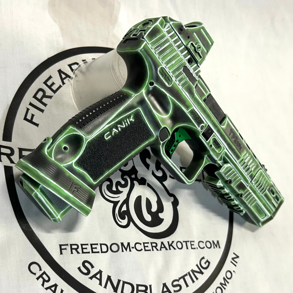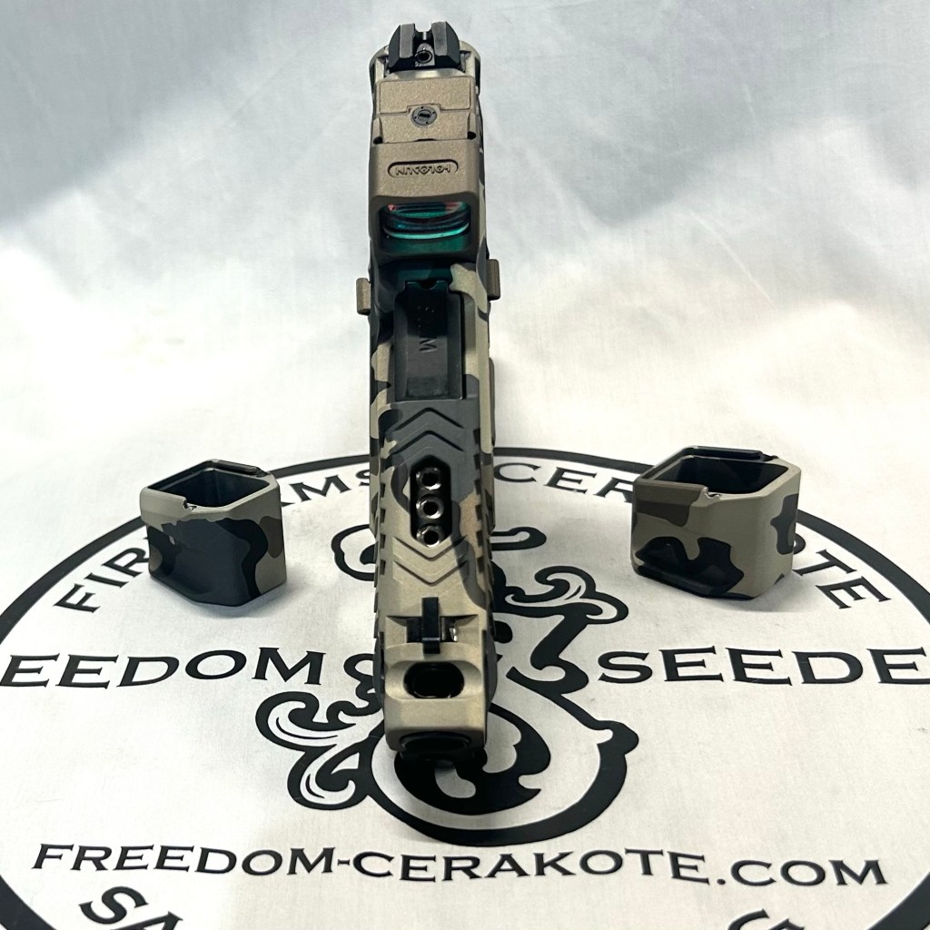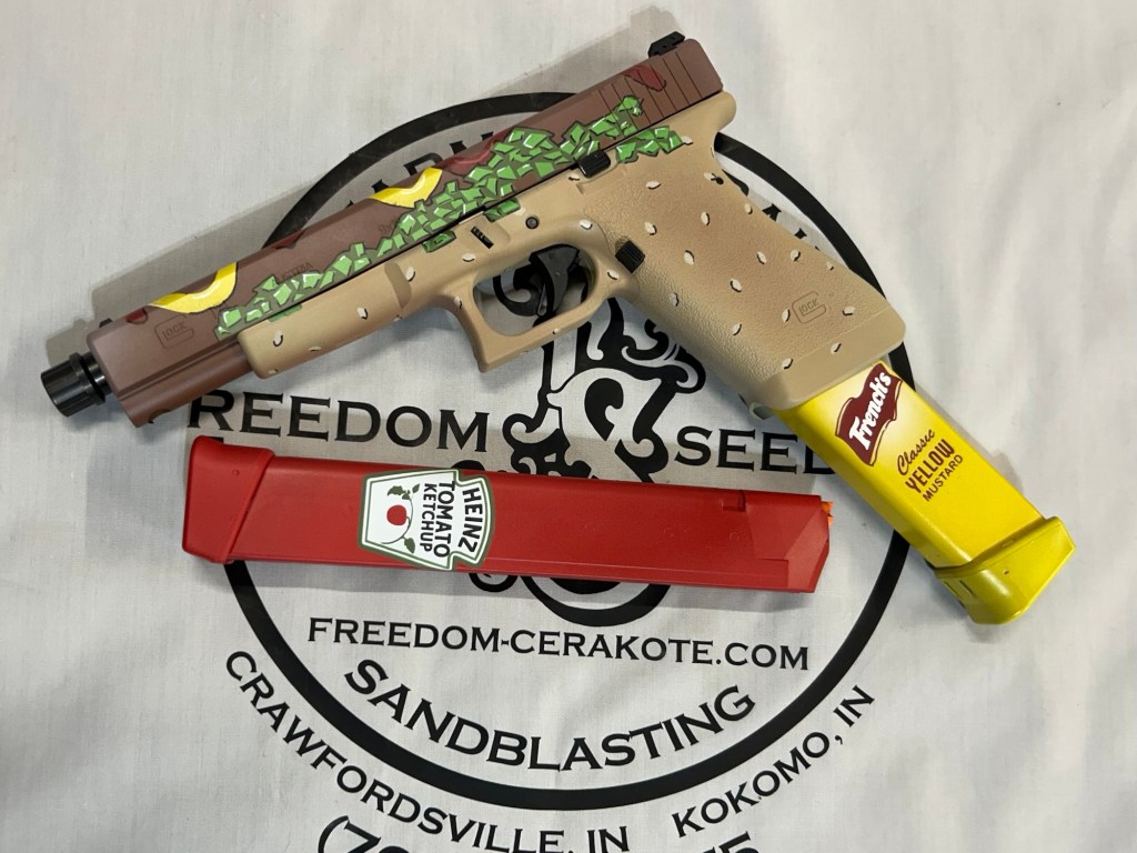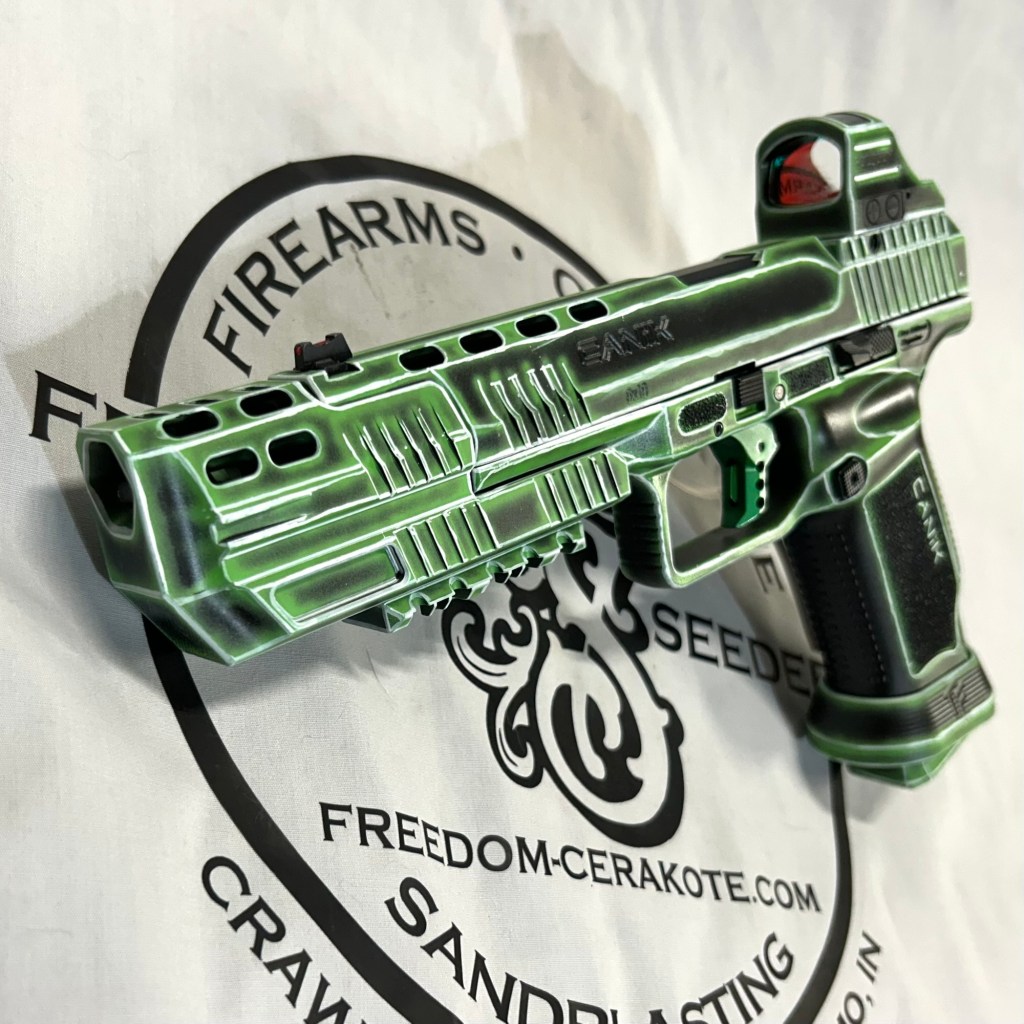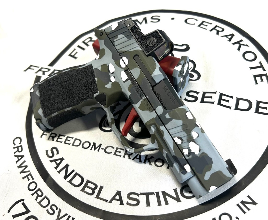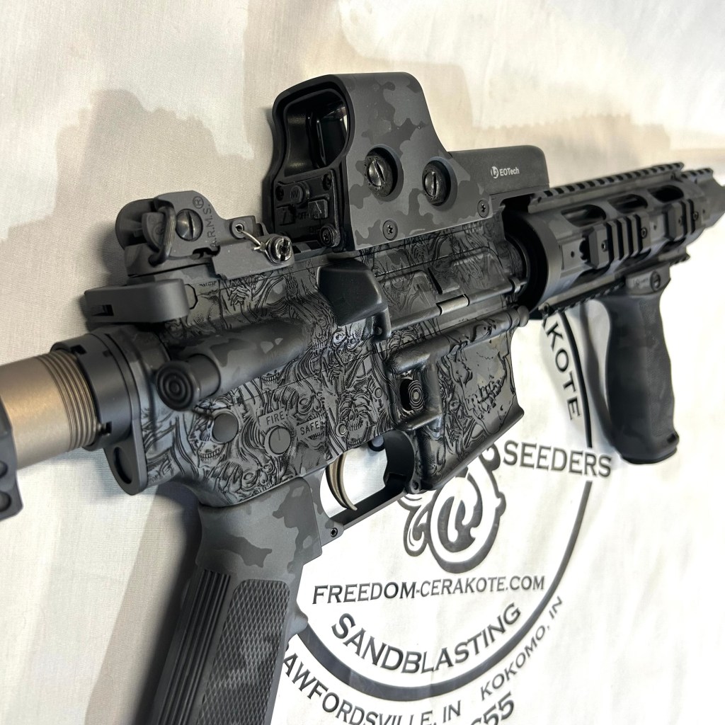 “Glizzy” Glock 17L w/ Ketchup & Mustard Mags Smith & Wesson MP9 in Kuiu Vias CamoNeon Canik TP9Custom mix “Plum Crazy Purple” AR Furniture & Handguard InteriorGhost Camo AR RifleChocolate Chip Camo P365XL.308 Bolt Action Restoration FNX 45 Cel Shade CerakoteCustom Mixed “Smoked Copper” Aero Precision Builders KitGlittered Custom Glock SlideMetallic Kuiu Vias Camo 1911Hibiscus Print Glock Slide + AccessoriesWhite Cel Shade on a Freedom Seeders AR9 Custom BuildDistressed Gold Desert Eagle Restoration HK CC9 Barrel + Controls in HK Red w/ Black Color Filled LetteringCel Shade Sig P322 + Holosun Red DotNeon Lights/Tron Style Canik SFX Rival + Holosun Optic/LightRefinished Rifle Receiver – yep, we do simple jobs tooBrowning CitoriNeon/Tron style on P365 Macro XCustom-Mixed Grey/Gold P365XLCel Shade/Comic Book AR Receiver Set + HandguardCel Shade SigFlaked/Glitter coated GlockHighland Ghost Camo AR SetHellcat Cel ShadeChocolate Chip Camo Glock SlideSpringfield Saint Victor Cel ShadeDirt Bike Components in Titanium + Graphite BlackAR9 backpack build in our winter take on Kuiu Vias camoCel Shade / Borderlands SigsRusty Rossi plinker cleanupUrban Camo 2-tone Ruger SFAR .308PT145 Cel ShadeGlock Slide Assembly. Colors: GunCandy MongooseCivil War Kentucky Rifle full restorationCel Shaded AR-10 LowerMossberg 715TGreen Ghost Camo AR Build SetP365 XL Macro“Tiger Shark” EPC 9mm buildMossberg 715TP-51 Mustang inspired Springfield XD9Black & white distressed American flag on Taurus G3CCel shaded/manga themed ARUrban camo receiver set, hadndguard, & stock on a Freedom Seeders custom buildTaurus G2S in brushed copper finishCustom AR buildFull P365XL full jobHandguard & receiver set in dark distressed copperGalaxy can-cannonCustom Glock 19 – built by Freedom Seeders Firearms – Colors: GunCandy Mongoose + Smoked BronzeAR9 with receiver and handguard done in 2-tone finishSig P365x-Macro Colors: Robins Egg Blue topped with GunCandy Pegasus on the slide + mags. Frame: Desert Sand base + topped with GunCandy AlpineFreedom Seeders custom buildEPC9 build put together through our FFL location.Sig P365XLA start to finish from raw aluminum, sandblasting, to coating.Glock Slide with Armor Black base topped with GunCandy ViperCustom PMags are the easiest way to make your firearm stand out or quickly distinguish different calibers. Provide your own, or let us provide them new for you!Cerakote Suppressor work? We’ve got some awesome ideas!Options capable of withstanding 1800° are perfect for your go-fast partsAnother hardware restoration project for a historic home. 1904 hardware door hardware brought back to life while preserving the vintage finish of the rest of the home.Hardware restoration? We can help! Laying down some color samples after sandblasting a few pieces for a customer (first 2 pictures). Finally ended on an ‘oil rubbed bronze’ look, using Copper and Graphite BlackAntique restoration and refinishingBefore & After – 20” Wheels in Glacier Gold C-SeriesNever loose your tools again and be seen in low light with Cerakote’s Hi-Vis Orange.Ghost topography stencil work. Colors: Custom mixed grey base, Crushed Aluminum mid-coat, topped with GunCandy Kraken top-coat.Aero Precision receiver and SLR handguard AR9 – Built by Freedom Seeders FirearmsQuite a bit more than Cerakote went into this on. Fire controls stripped repaired and Cerakote in Graphite Black. The original brass was cleaned and polished. Wood Stock repaired and refinished. New ramrod made and stained to match. Barrel stripped, new ramrod thimbles installed. Cerakote in Black Velvet + Graphite BlackFreedom Seeders tumblers available now! Pick one up today, or let us custom make one with your design or logo.A few custom tumbler projects. Dark hand-distressed flag Tumbler, bulk run. Available nowAntique tackle box turned vintage distressed shop tool box